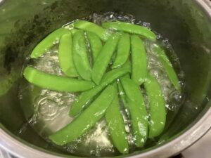 ①さやえんどうは筋を取って洗い、熱湯でさっと茹で流水で冷まし、ザルにあけておく。