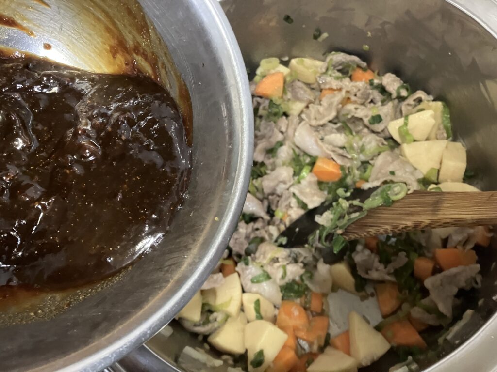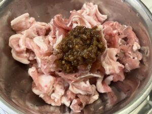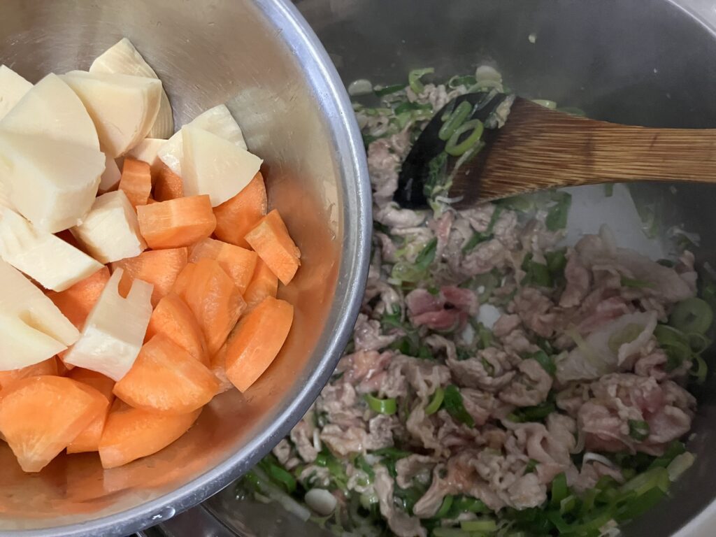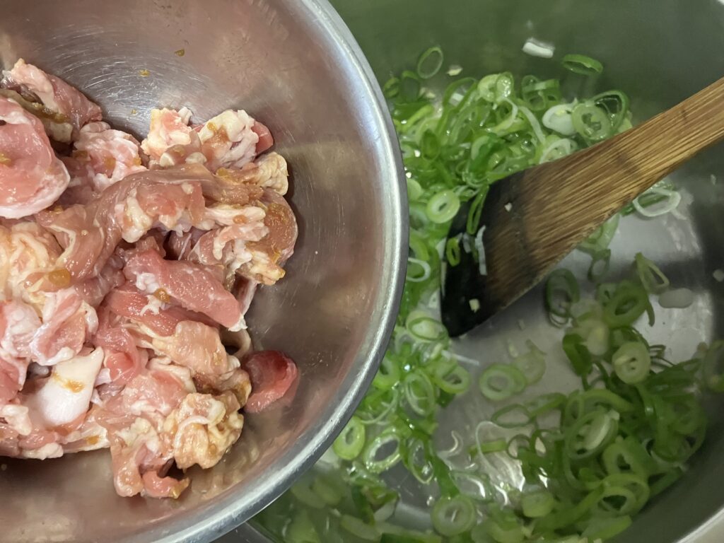 ②にんじんはいちょう切り、ねぎは小口切り、生姜はみじん切りに、豚肉は食べやすい大きさに切って小さじ2の醤油または醤油麹小さじ2を揉みこんでおく。