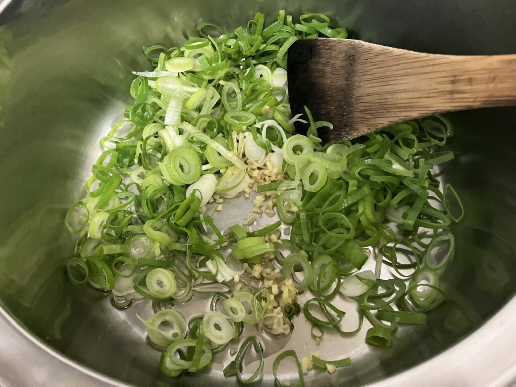 ⑤油を熱し、ねぎ・生姜を炒め、豚肉・にんじん・たけのこも入れて炒める。