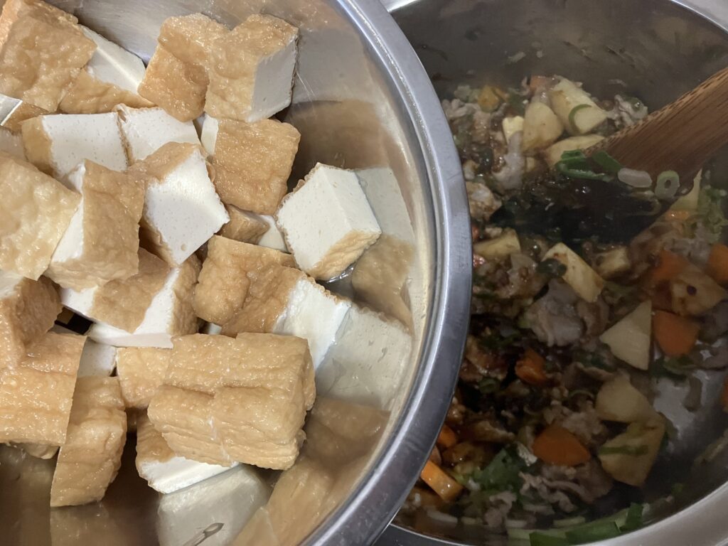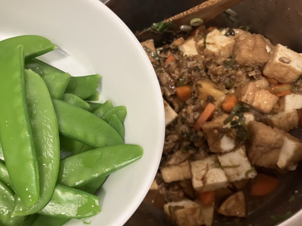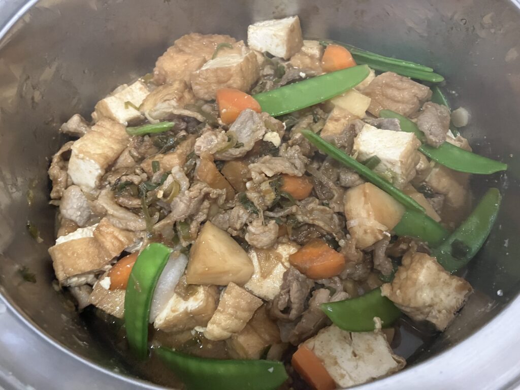 ⑥具が柔らかくなってきたら[4]の混ぜ合わせた調味料・[3]の生揚げ・[1]のさやえんどうを入れてさらに炒めたら、できあがり♪
