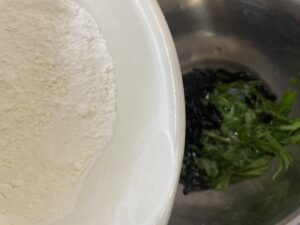 ③ボウルに水・塩・戻したひじき・青じそを入れ、混ぜ合わせる。そこにふるった薄力粉を入れ、粘りが出ないように混ぜて衣を作る。