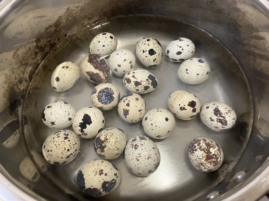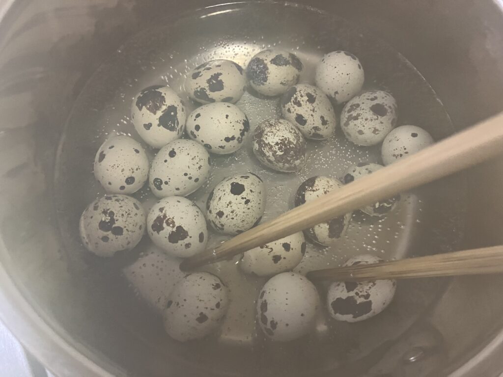 ②うずらの卵は茹でて殻を剥いておく。