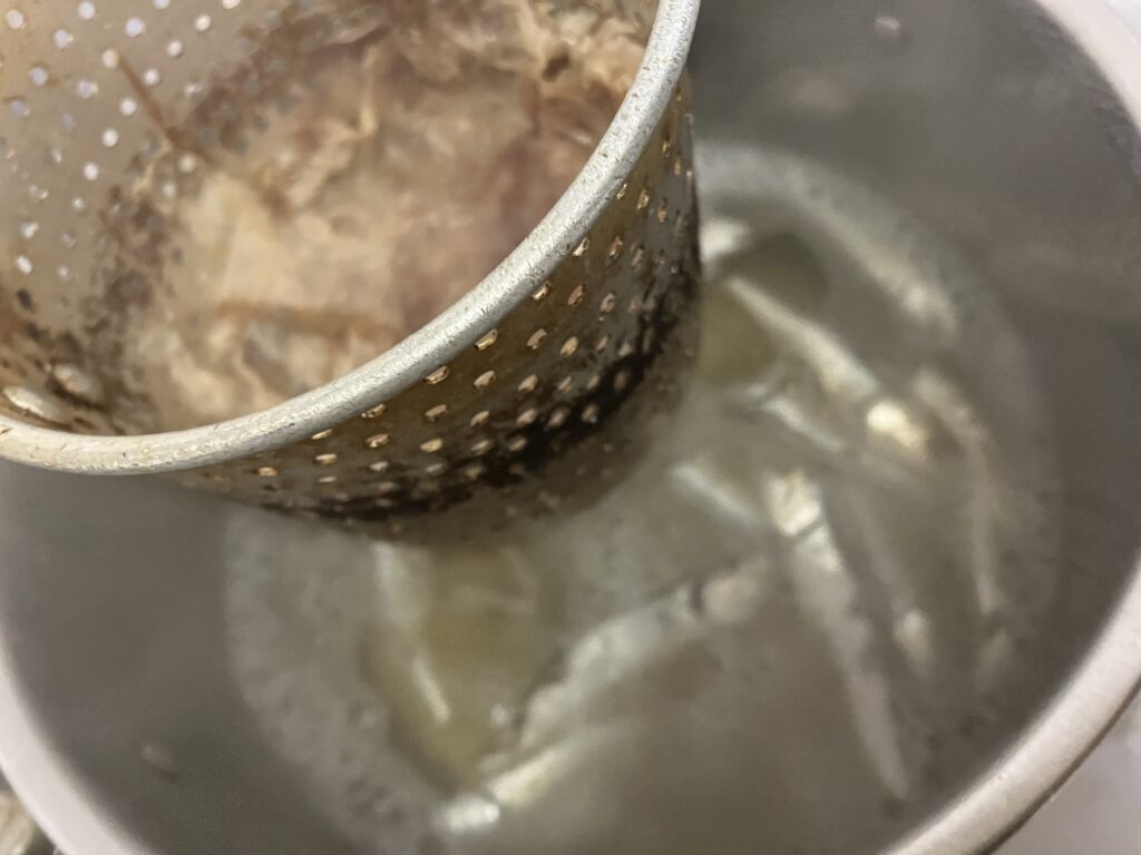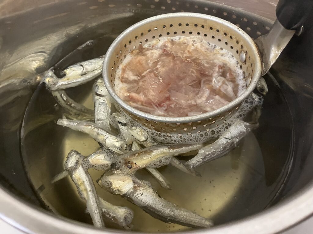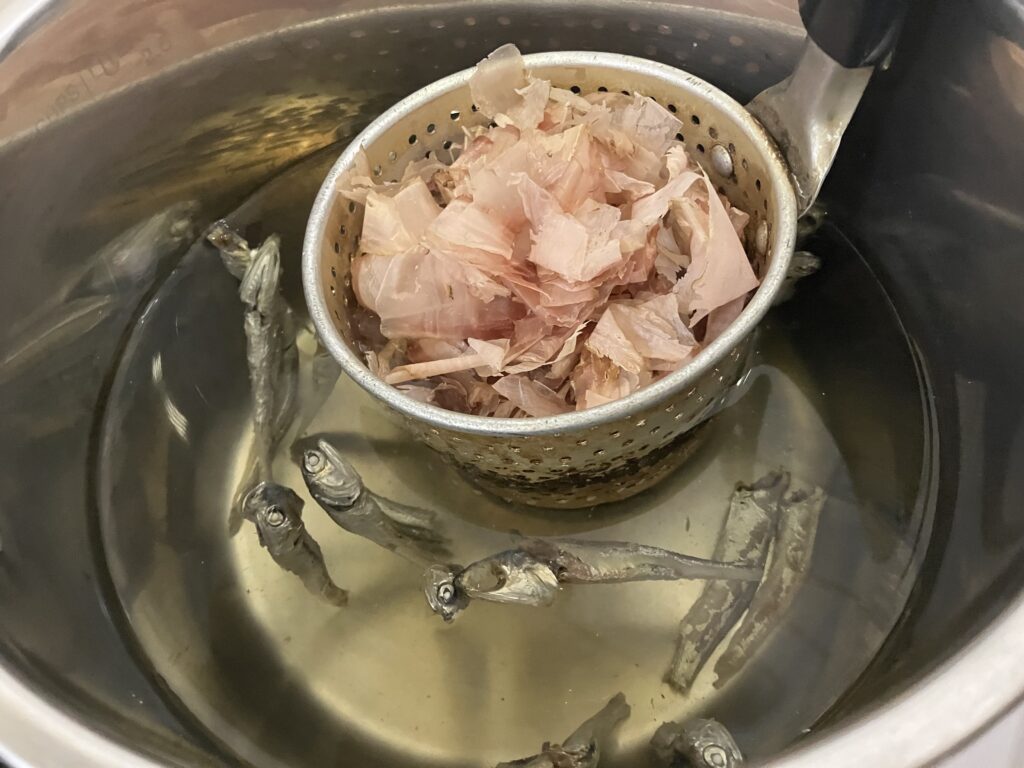 ⑤[1]に味噌溶きなどザル状のものに入れた鰹節を入れて火にかける。沸騰したら弱火にして5分ほど煮出したら鰹節を絞りすぎないように気を付けながら水気をきって煮干しと共に取り出す。