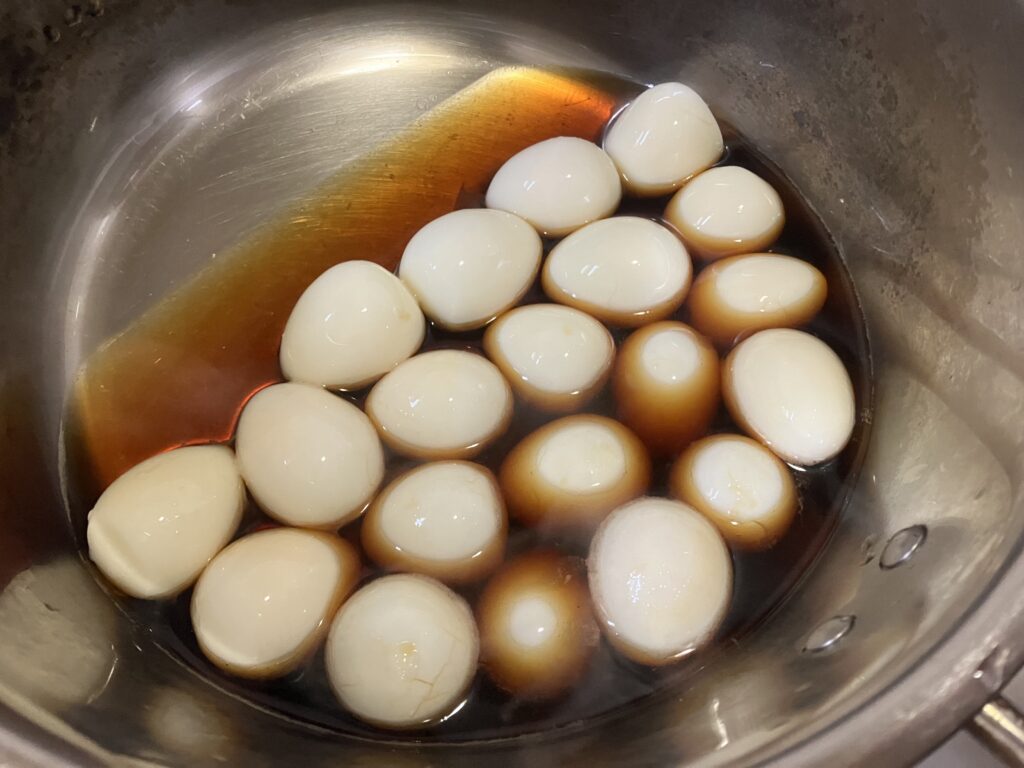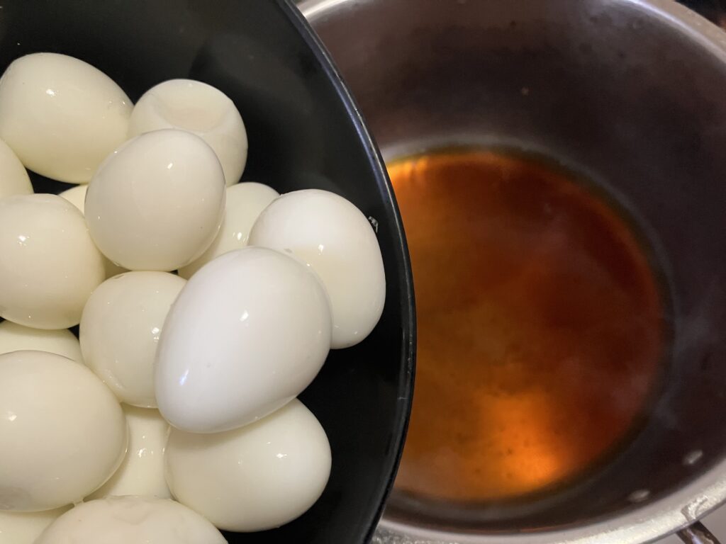 ③鍋に砂糖・しょうゆ・酒・みりん・水を入れて煮立てた中に[2]の茹でて殻を剥いたうずらの卵を入れて煮る。