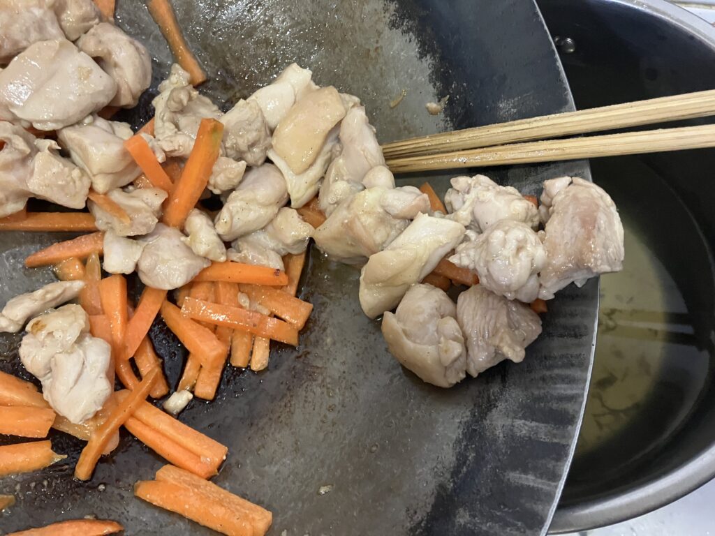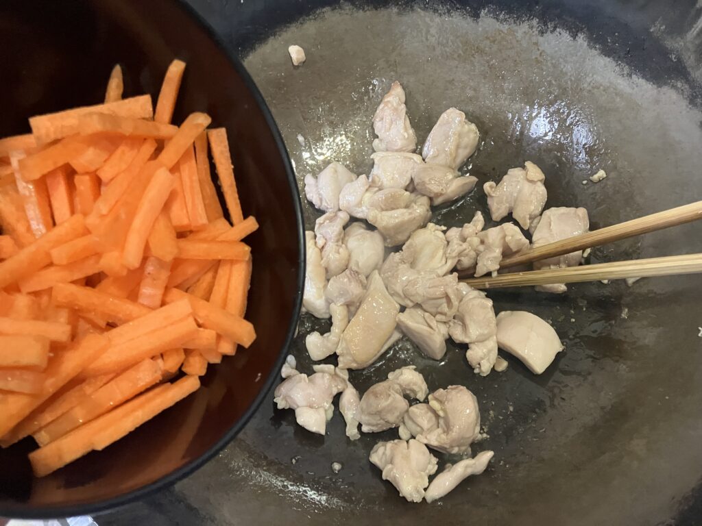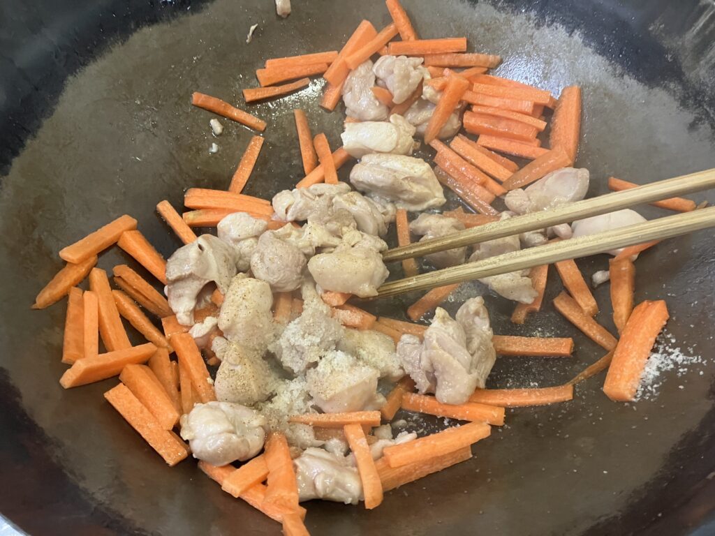 ⑥熱したフライパンに油をひき、鶏肉・にんじんの順に塩・こしょうをして炒める。