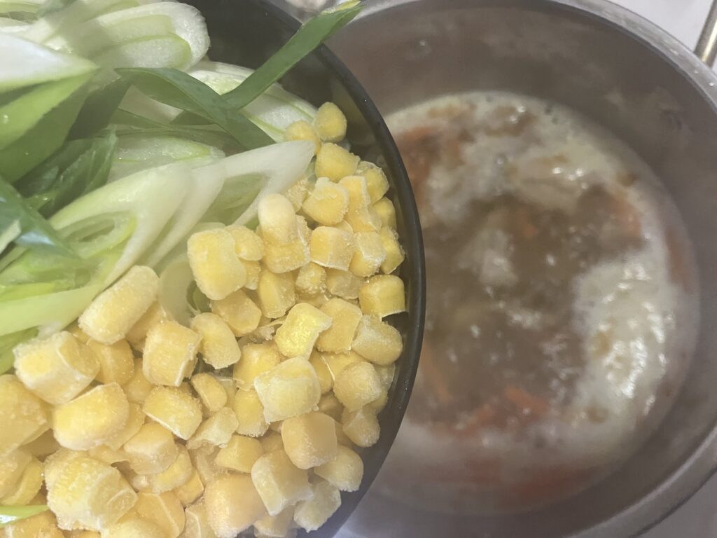 ⑦[5]のだし汁に[6]を入れ、沸騰したら(あれば)アクを取り、中華だし・しょうゆ・コーン・白菜・ねぎ・味付きのうずら卵も加えて煮る。