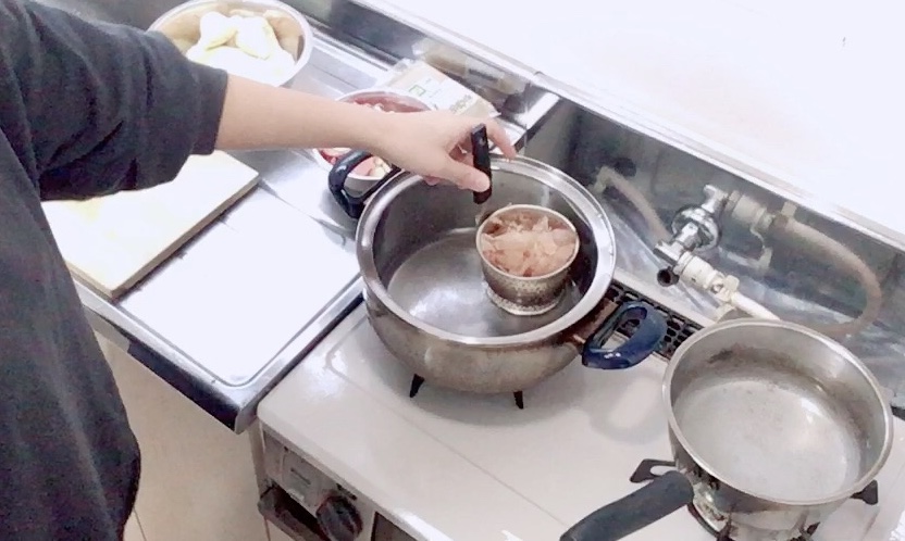 ③鍋に分量の水・豚肉・にんじん・大根・里芋・こんにゃく・みそ溶きなどザル状のものに入れた鰹節を入れて火にかける。