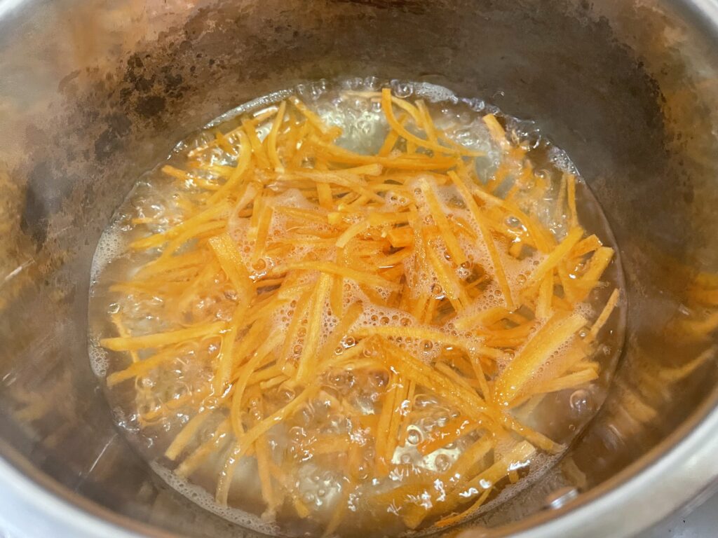 ① まず細切りにしたにんじんを分量外のお湯で茹ではじめる。