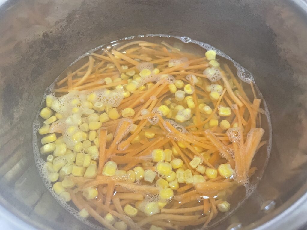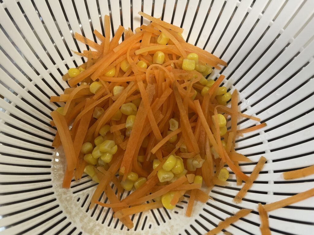 少し経ったらそコーンも加えさっと茹でたらザルにあけ、流水で冷まして水切りしておく。