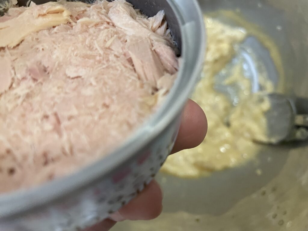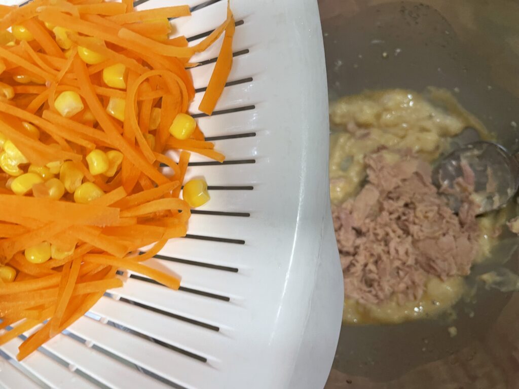 学校給食ではノンエッグマヨネーズが使われておりますが、我が家は自家製マヨネーズを使用。ツナ以外にも、鶏むね肉やササミを蒸したり茹でて裂いたものでも◎