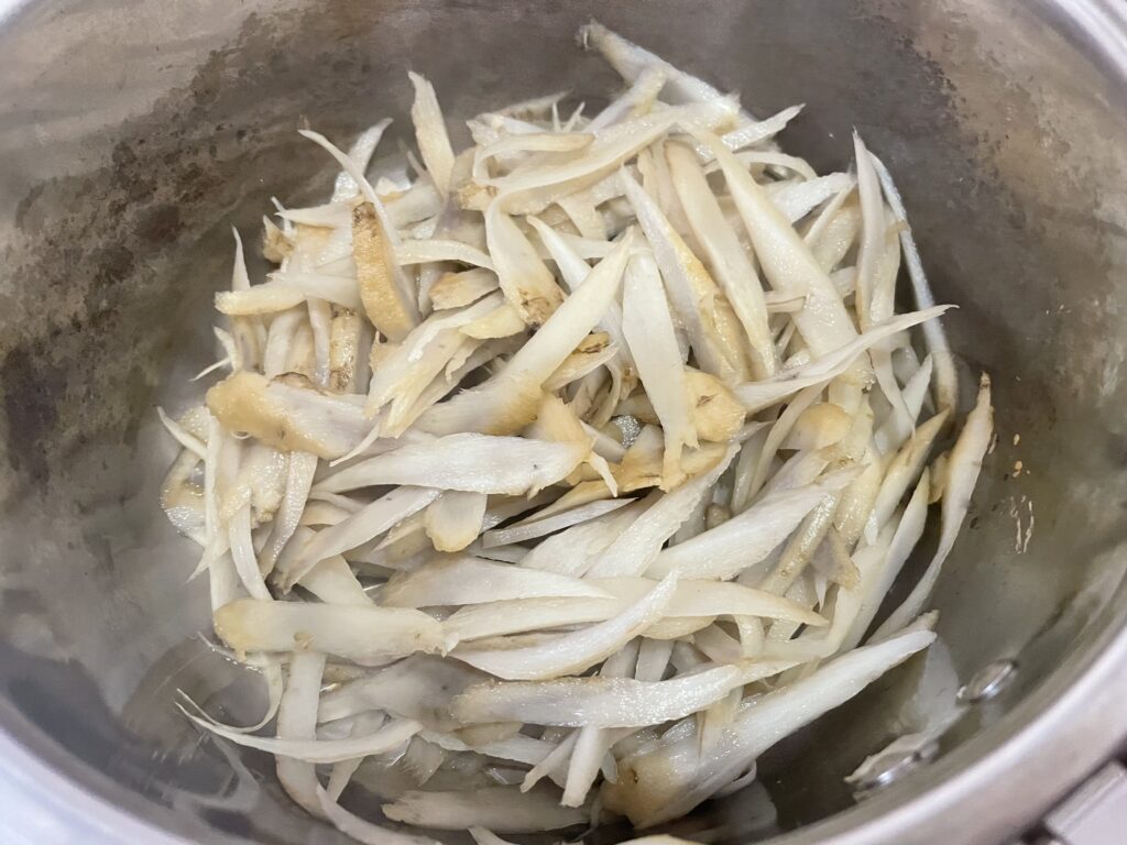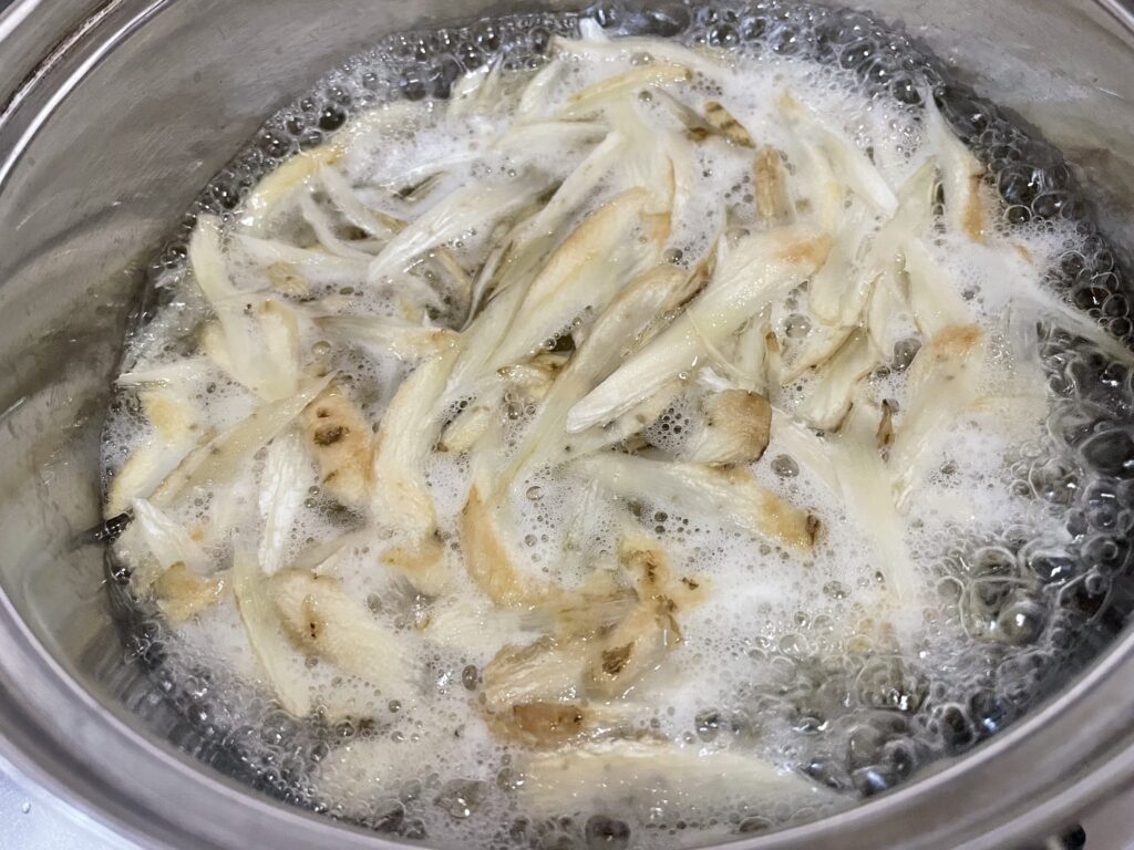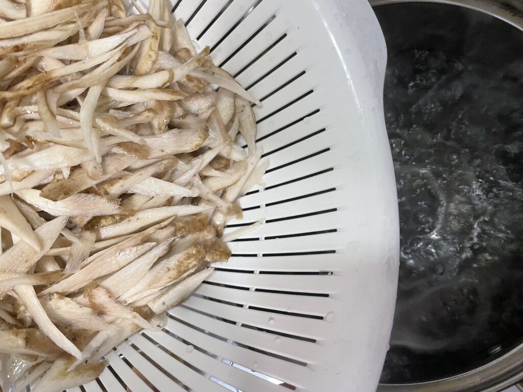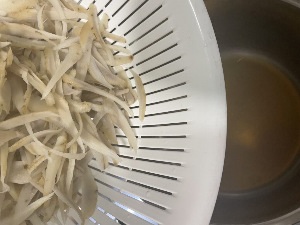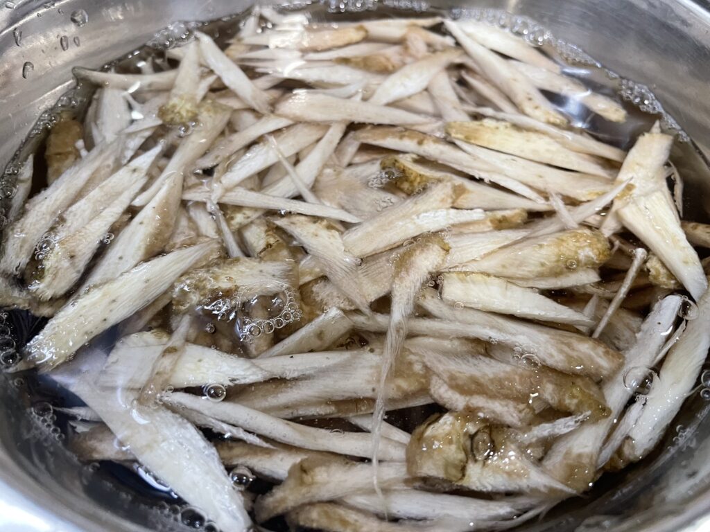 ②ごぼうはささがきにし、水にさらして分量外のお湯で茹で、水切りしておく。