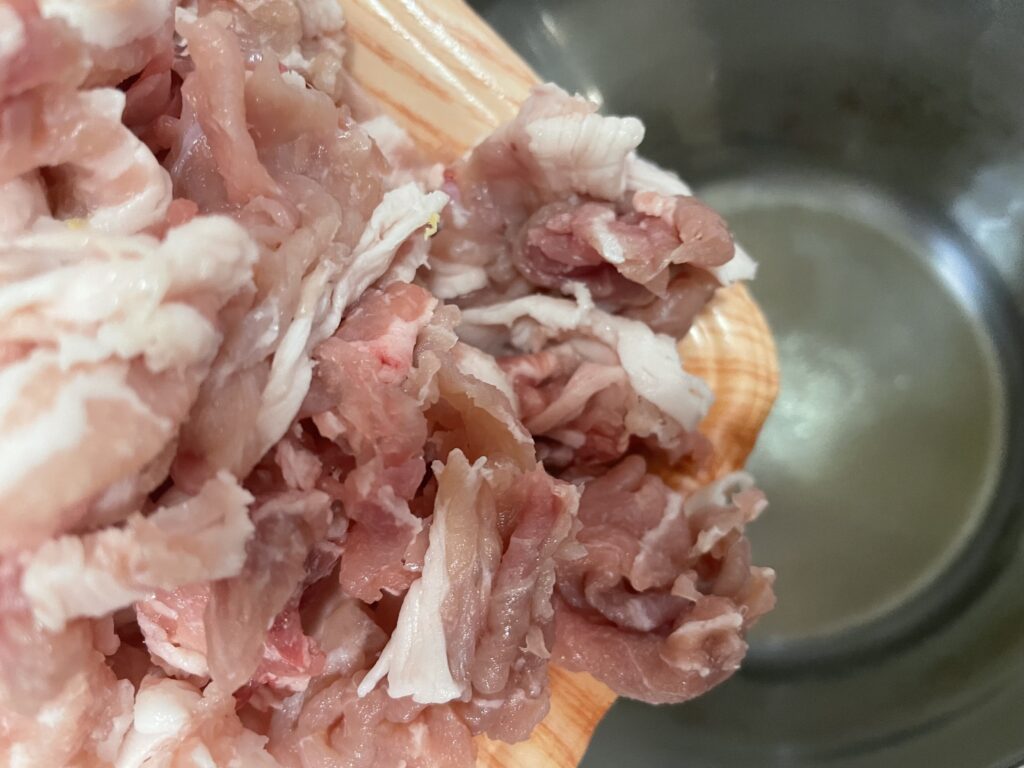 ②油を熱し、食べやすく切った豚肉・にんじん・玉ねぎの順にこしょうをしながら炒める。