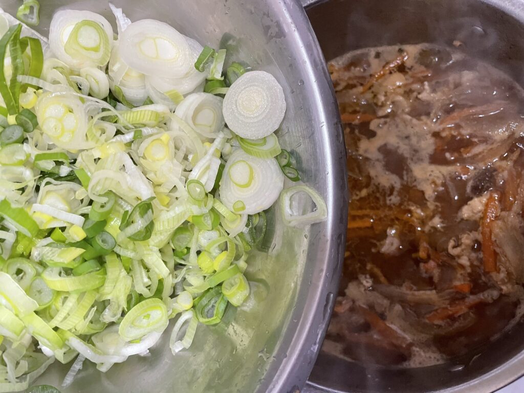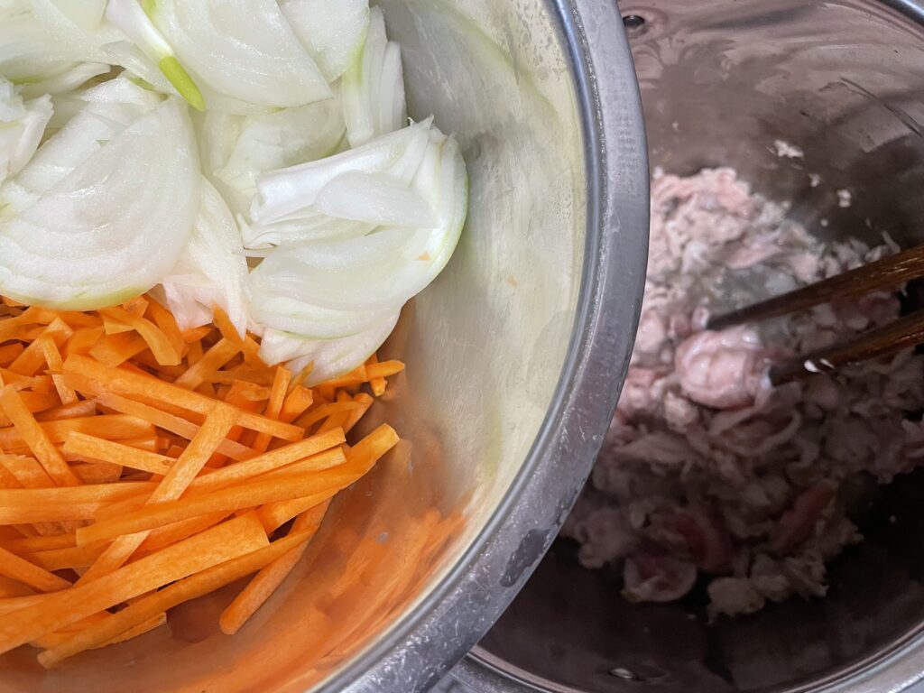 ①にんじん・玉ねぎは細切り、ねぎは小口切りまたは斜め切りにする。(今回は太かったので小口切りにしました。)