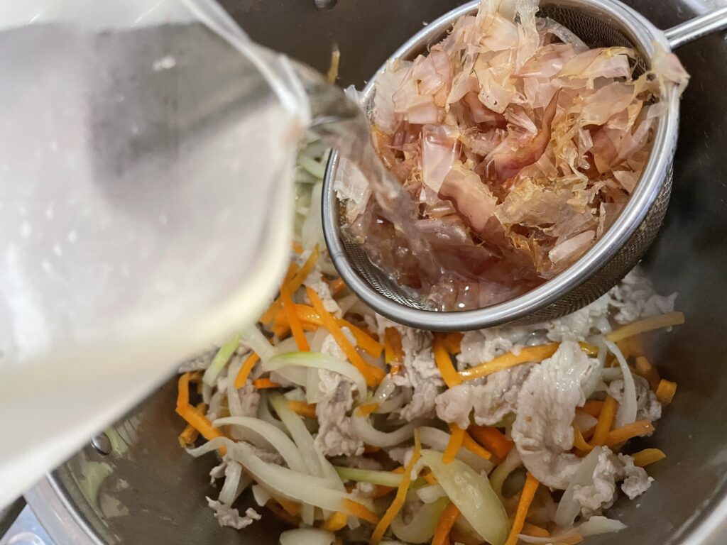 ③[2]に水・みそ溶きなどザル状のものに入れた鰹節を入れ、沸騰したら弱火にして2~3分煮出し、アクを取り、鰹節を絞りすぎない程度に出汁をきって引き上げる。