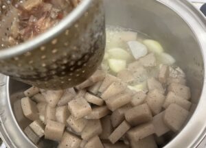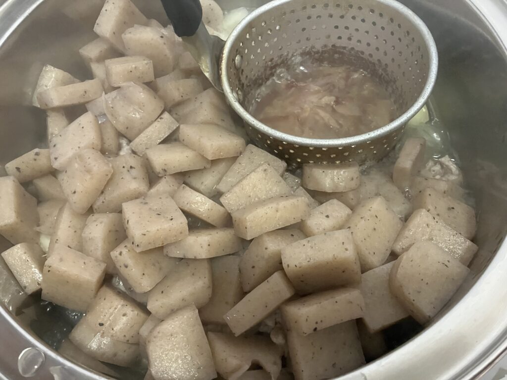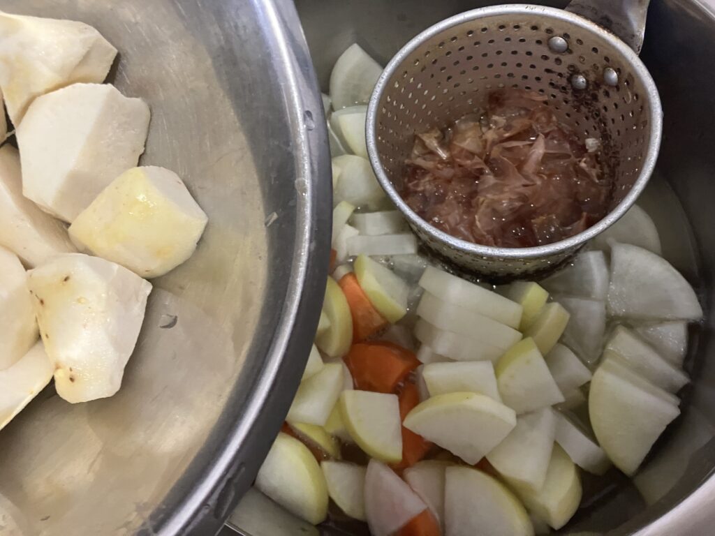 ③鍋に分量の水・豚肉・にんじん・大根・里芋・こんにゃく・みそ溶きなどザル状のものに入れた鰹節を入れて火にかける。