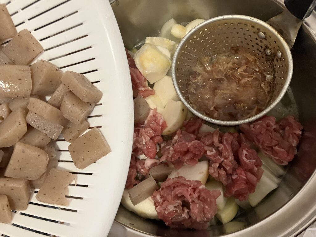 ④沸騰したら弱火にし、5分ほど煮出した鰹節の水気をきって取り出し、蓋をして具が柔らかくなるまで煮る。