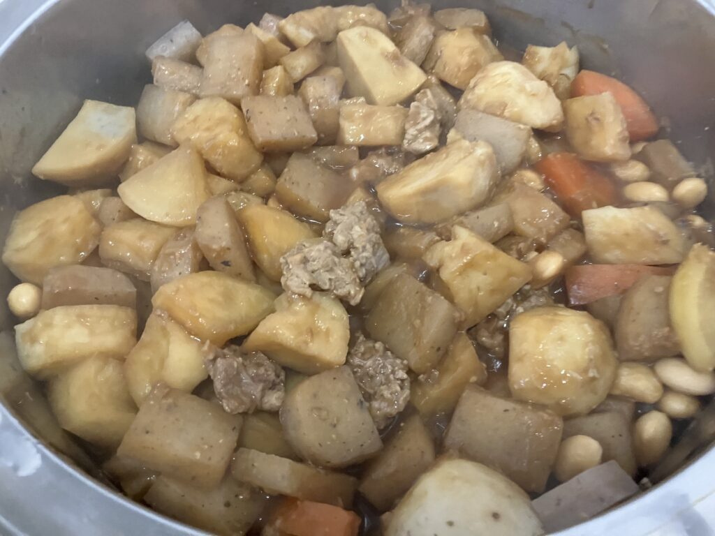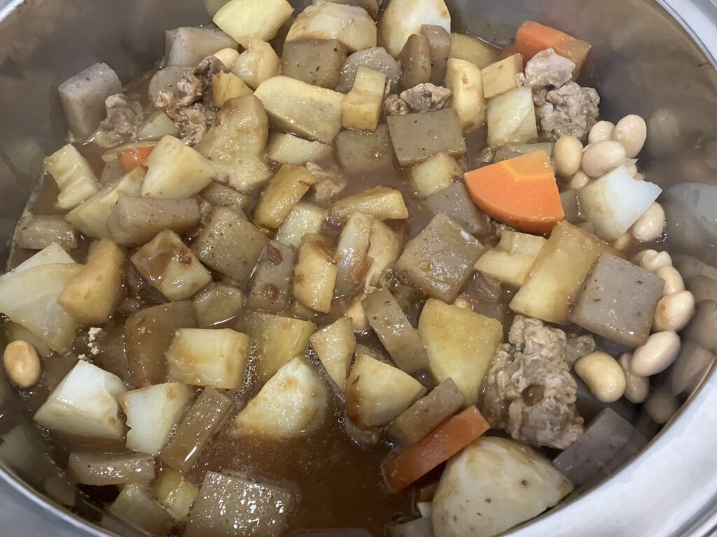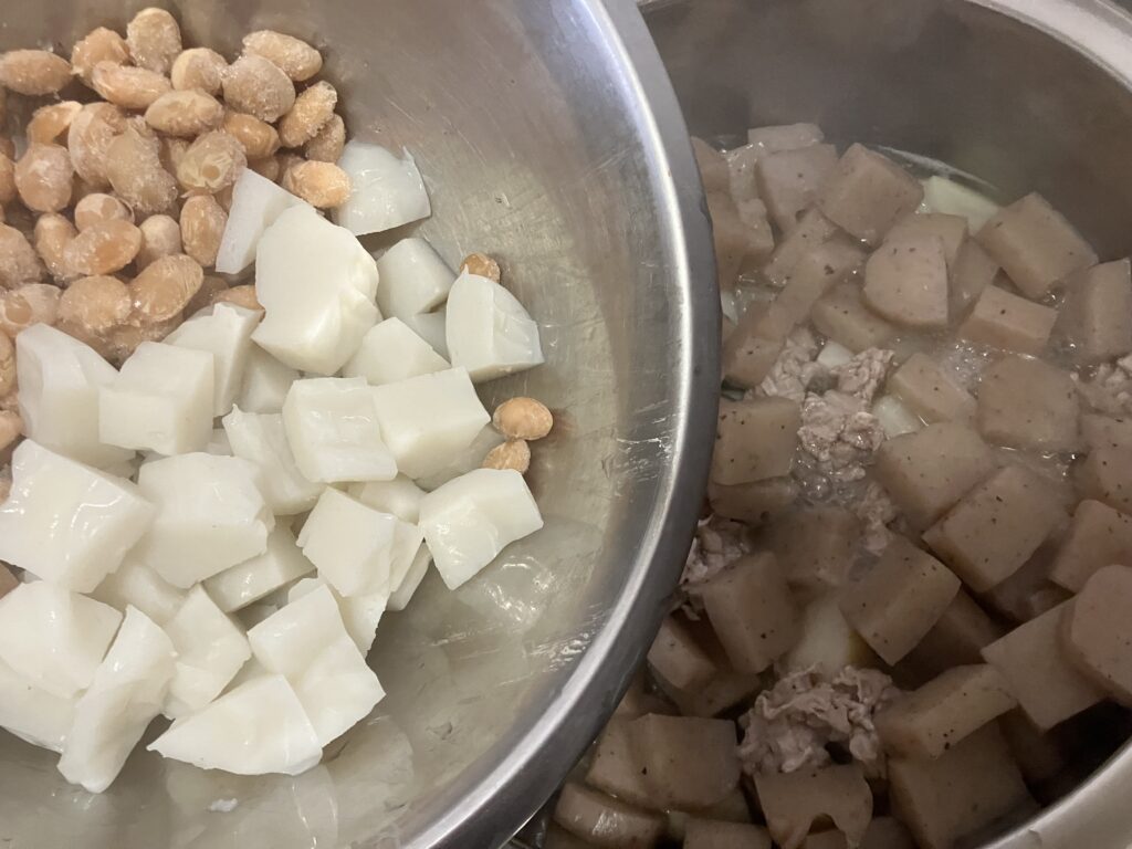 ⑤具が柔らかくなったら茹で大豆・はんぺん・砂糖・味噌を溶き入れ、煮込んだらできあがり♪