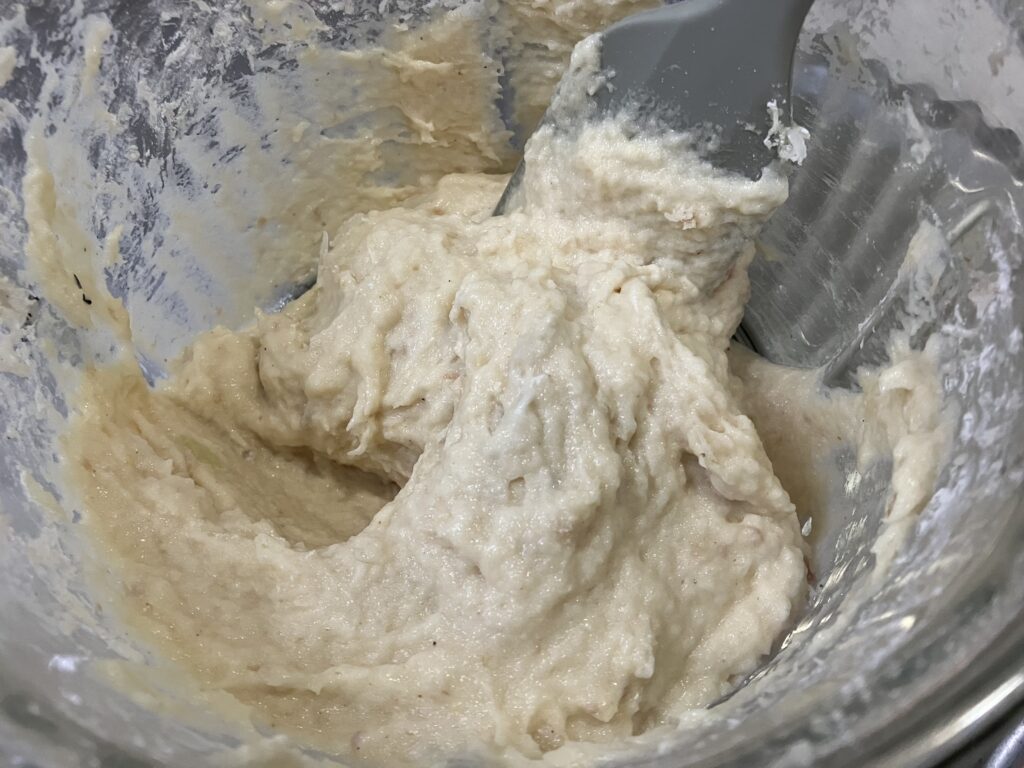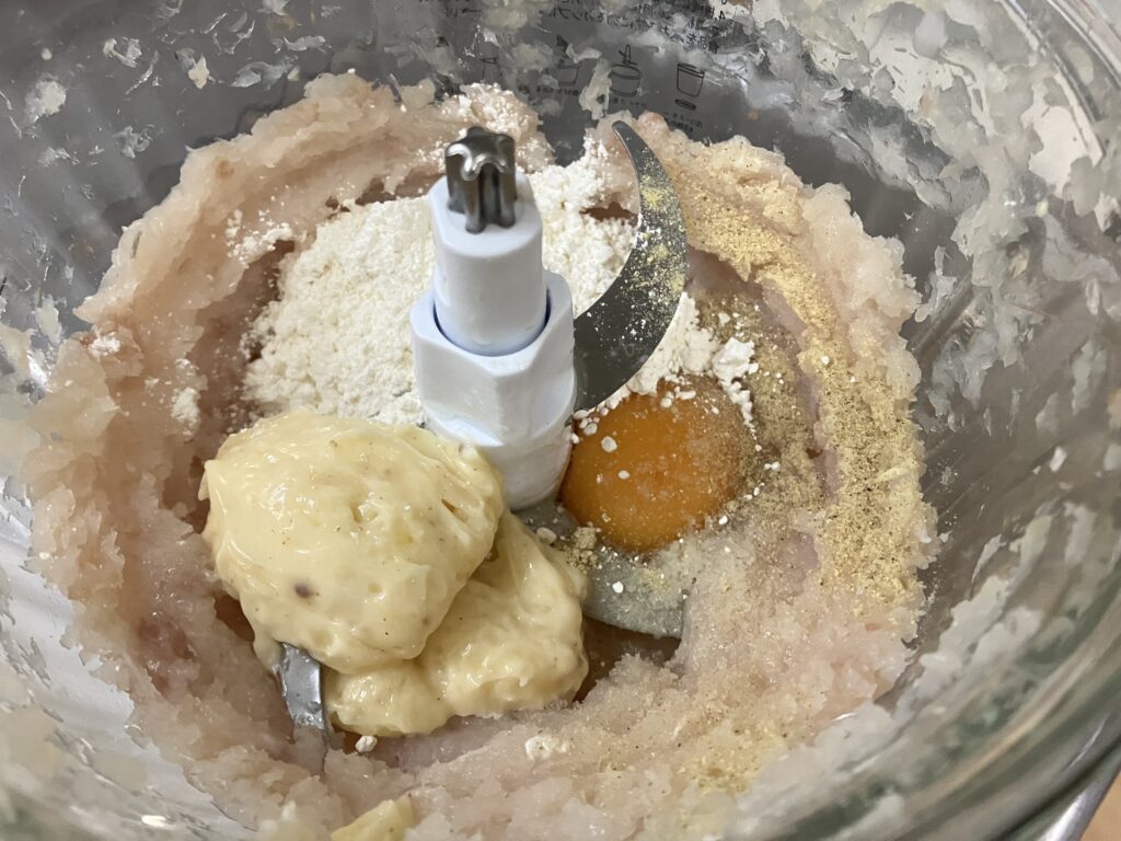 ③[2]に、すりおろしにんにく・すりおろし生姜・塩・こしょう・マヨネーズ・卵・薄力粉を全て入れ、混ぜ合わせる。