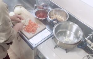 ①にんじんはいちょう切り、玉ねぎはひと口大、にんにくはみじん切りに、トマトはさいの目に切る。
