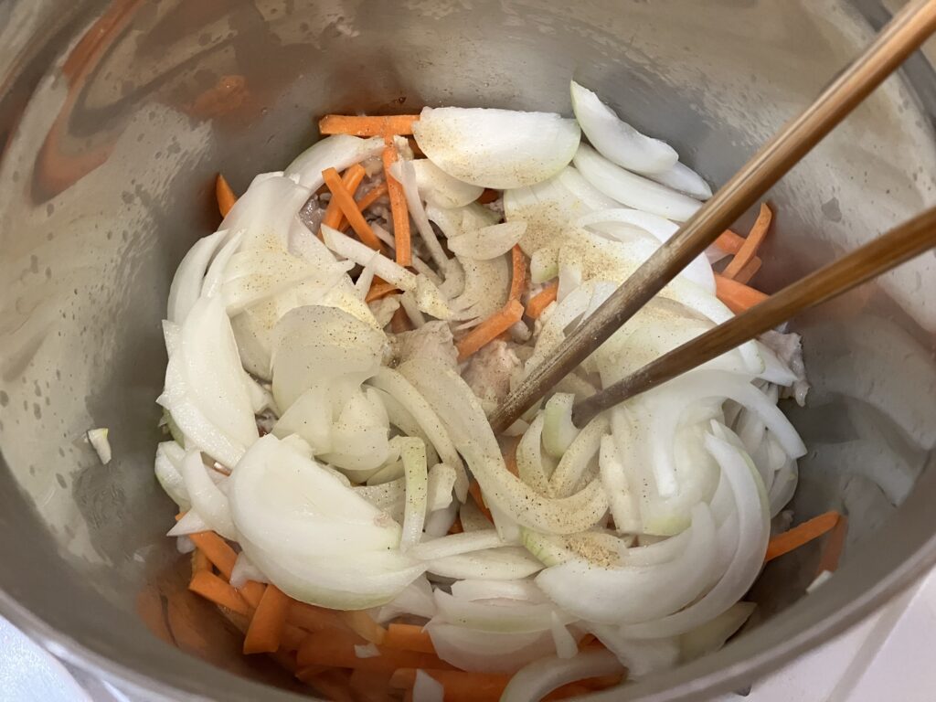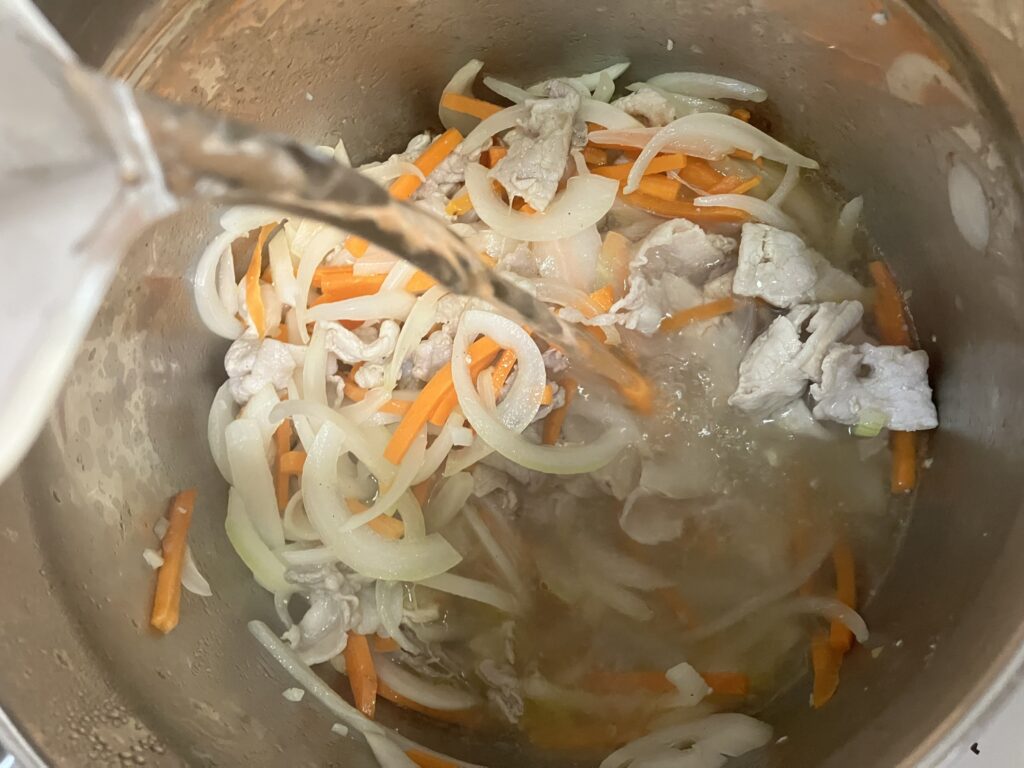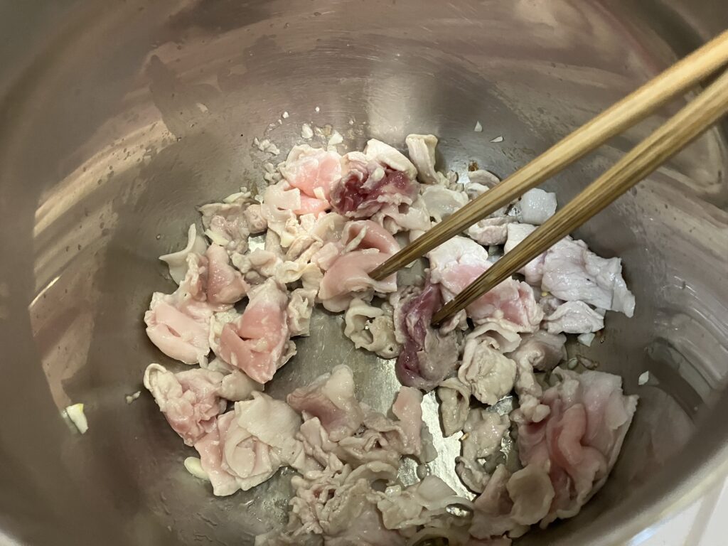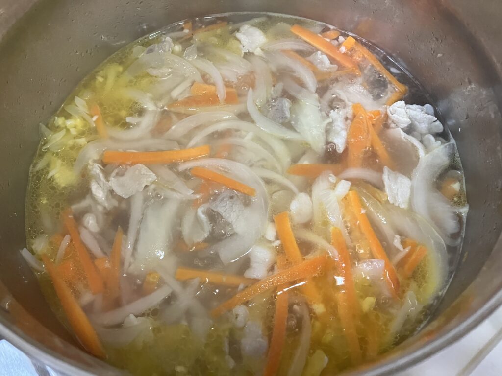 ② 鍋に油を熱しにんにくを炒め、食べやすい大きさに切った豚肉・にんじん・玉ねぎの順にこしょうをしながら炒め、水を加えて煮る。