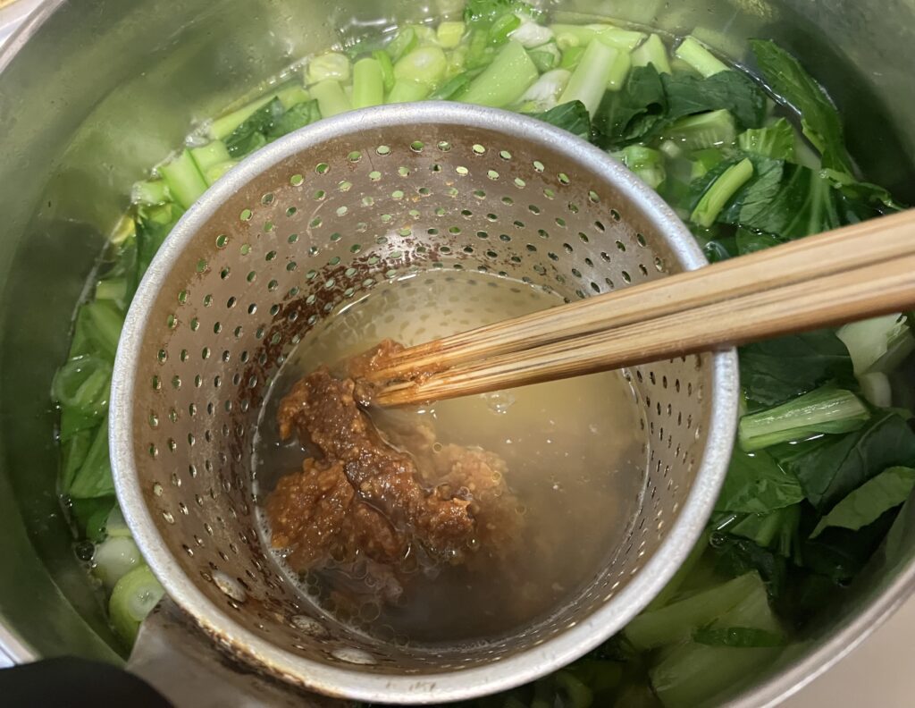 ③ 沸騰したら(あれば)アクを取り、野菜ブイヨン・ ねぎ・白菜やチンゲン菜、小松菜など・さいの目に切った豆腐・味噌・豆板醤・酒・しょうゆ・を入れ煮る。