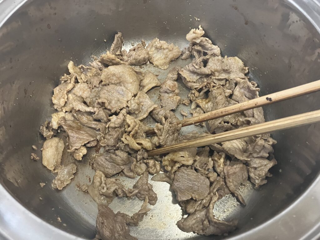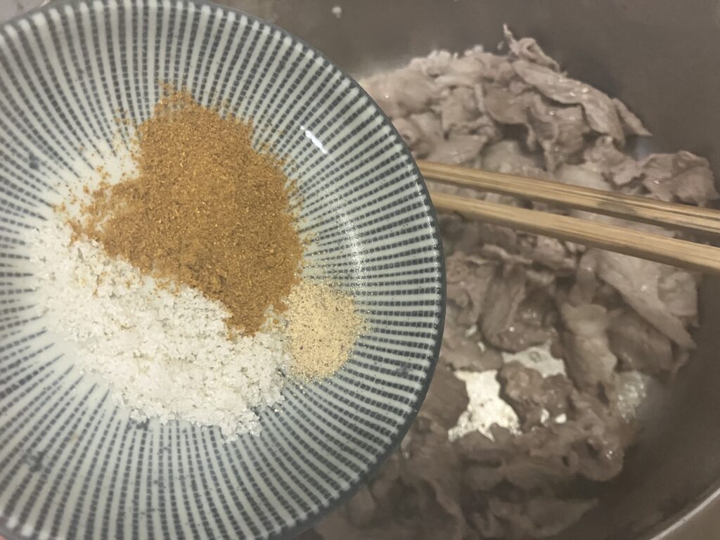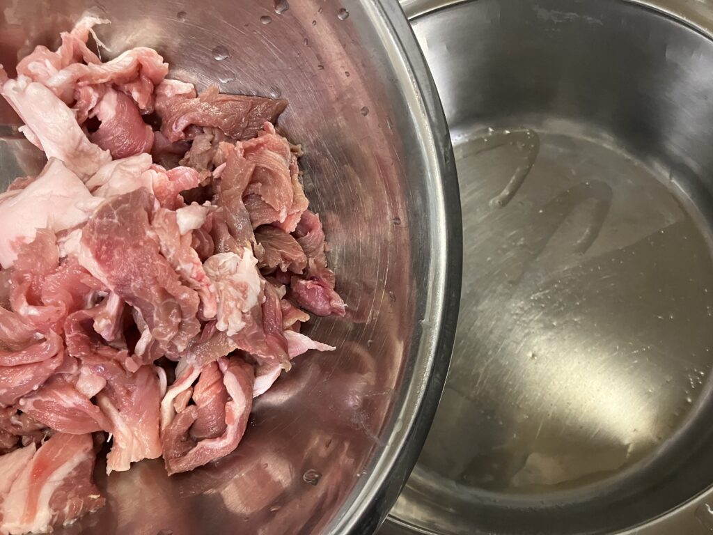 ②鍋を火にかけ油を熱し、豚肉を塩2g・こしょう0.2g・カレー粉1gをしながらしっかり炒め、取り出しておく。