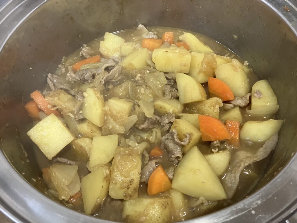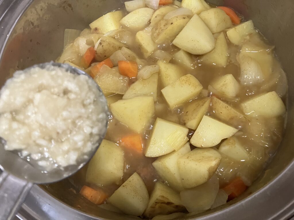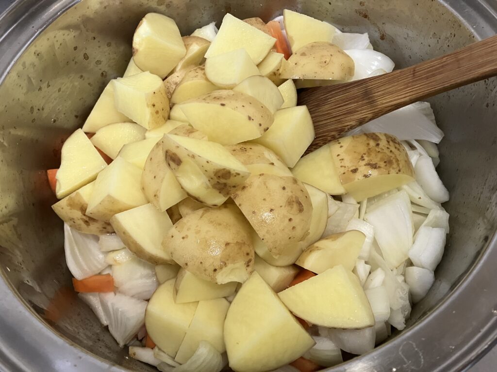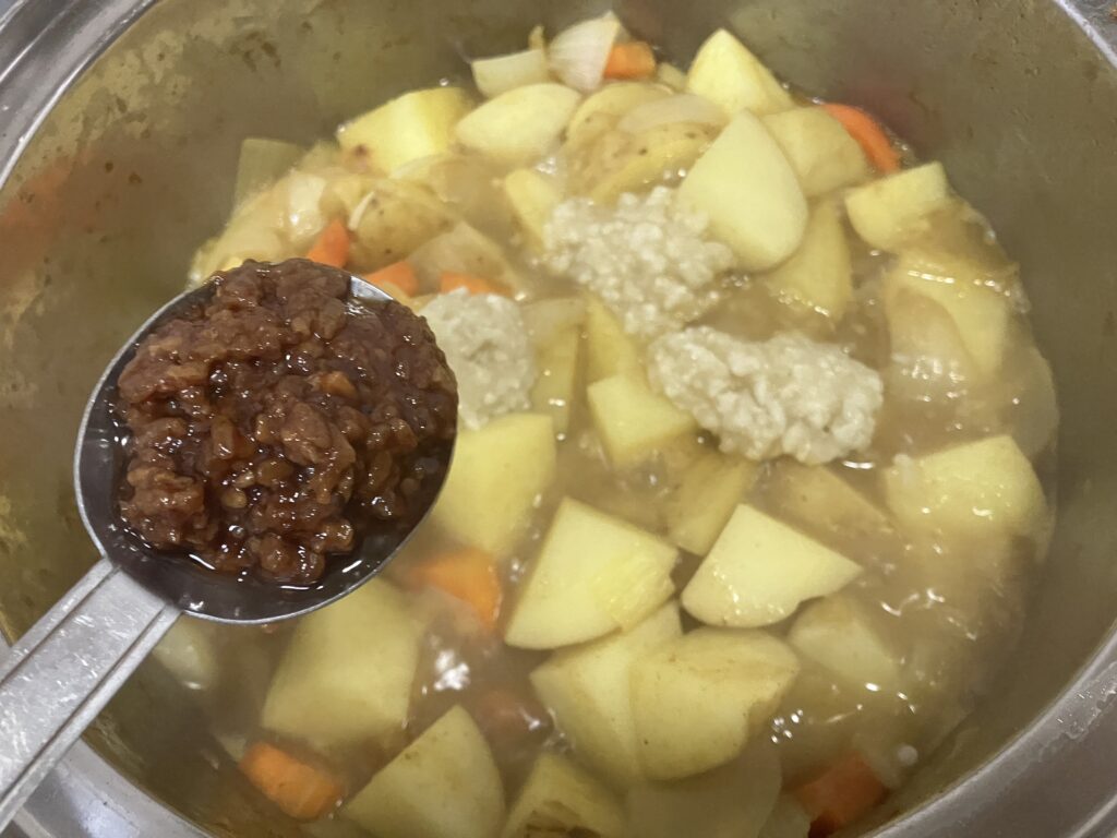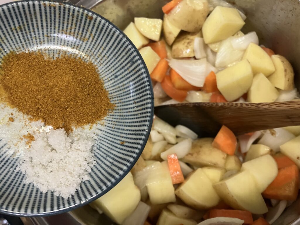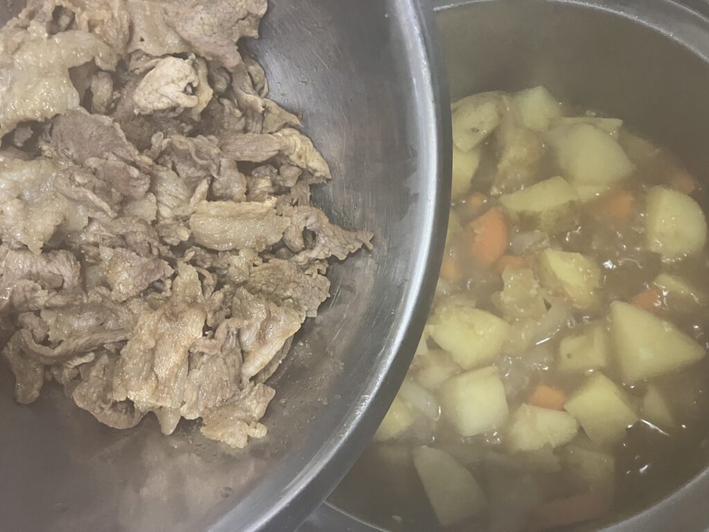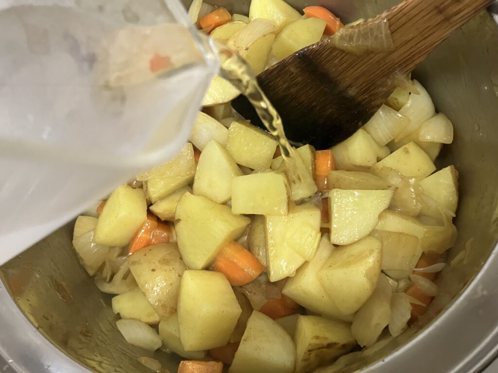 ③再び油を熱し、にんじん・玉ねぎ・じゃがいもの順に塩3g・カレー粉2gをしながら炒め、水を加えて煮る。