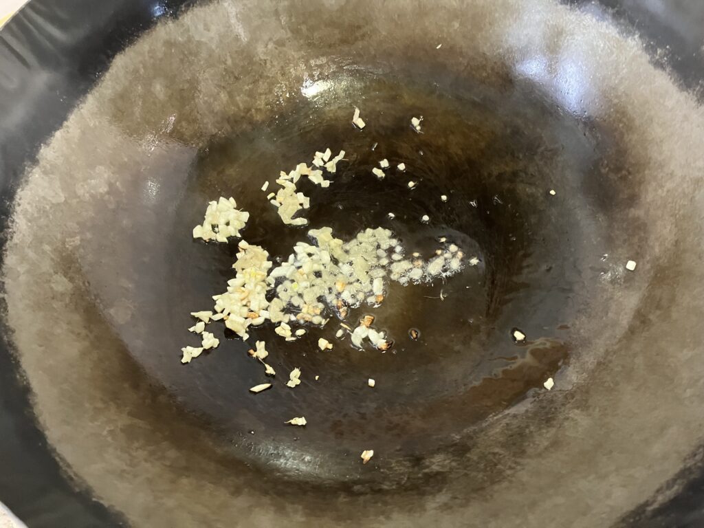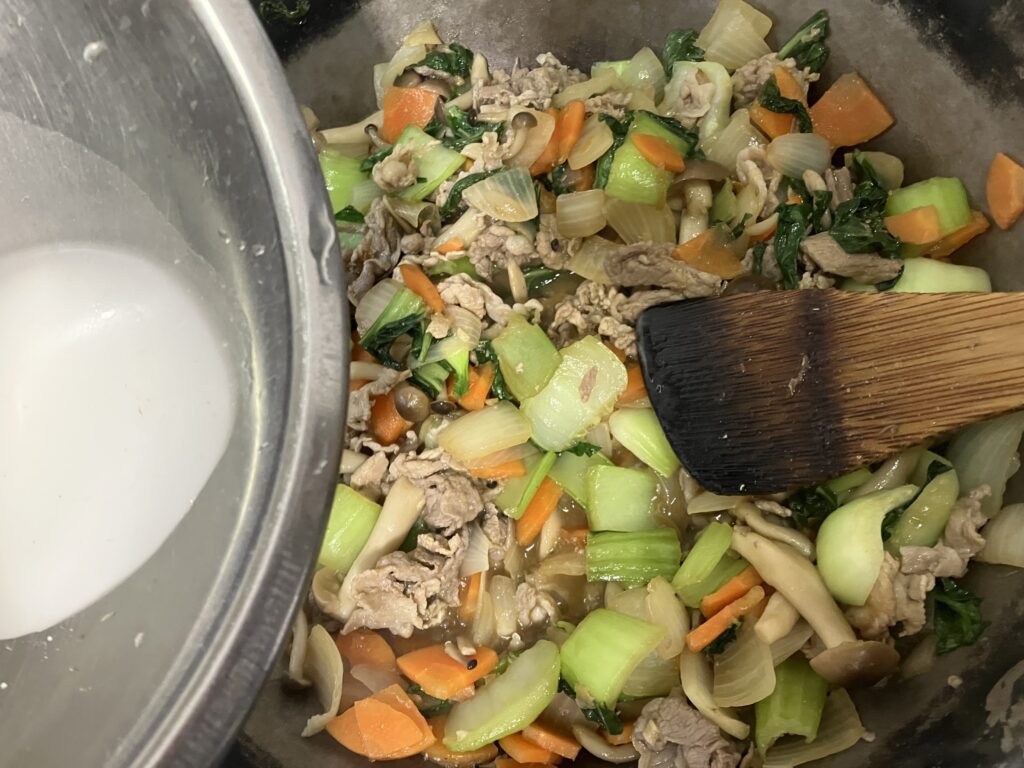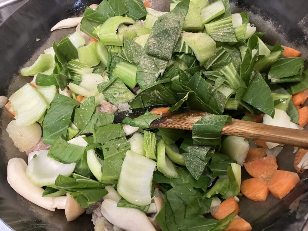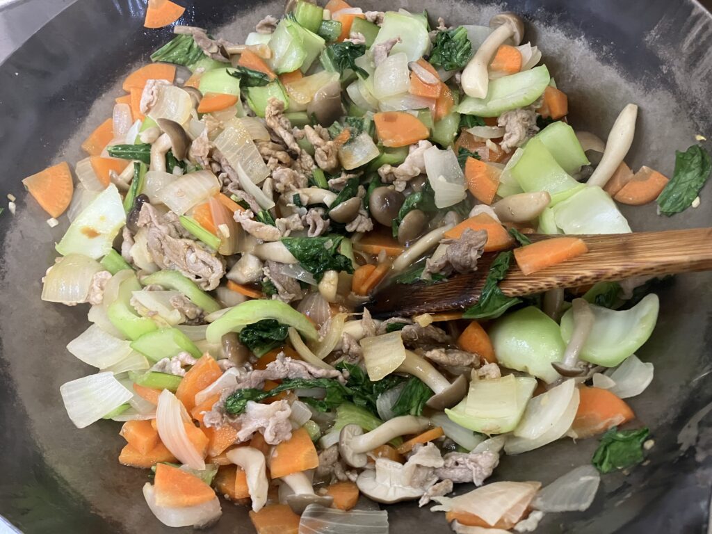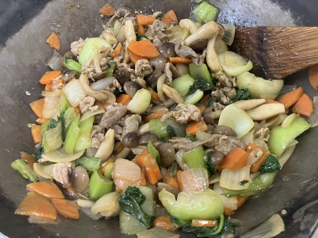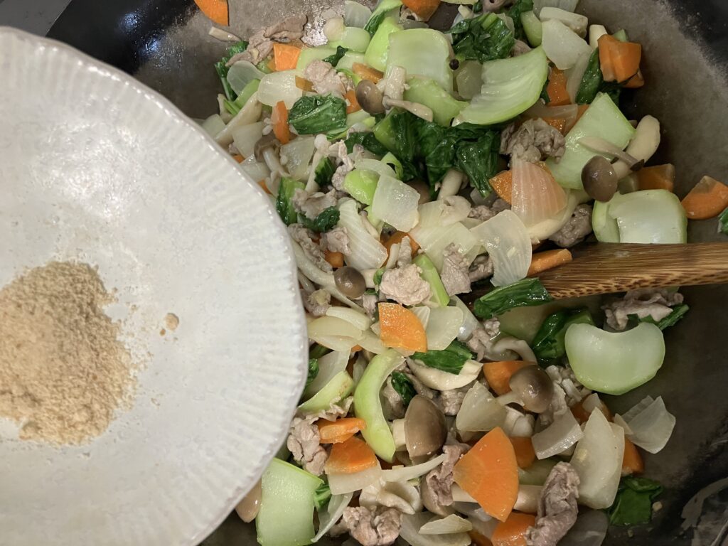 ②熱したフライパンに油をひき、生姜・にんにくを炒めたら豚肉・にんじん・玉ねぎ・しめじ・青梗菜の順に塩・こしょうをして炒める。