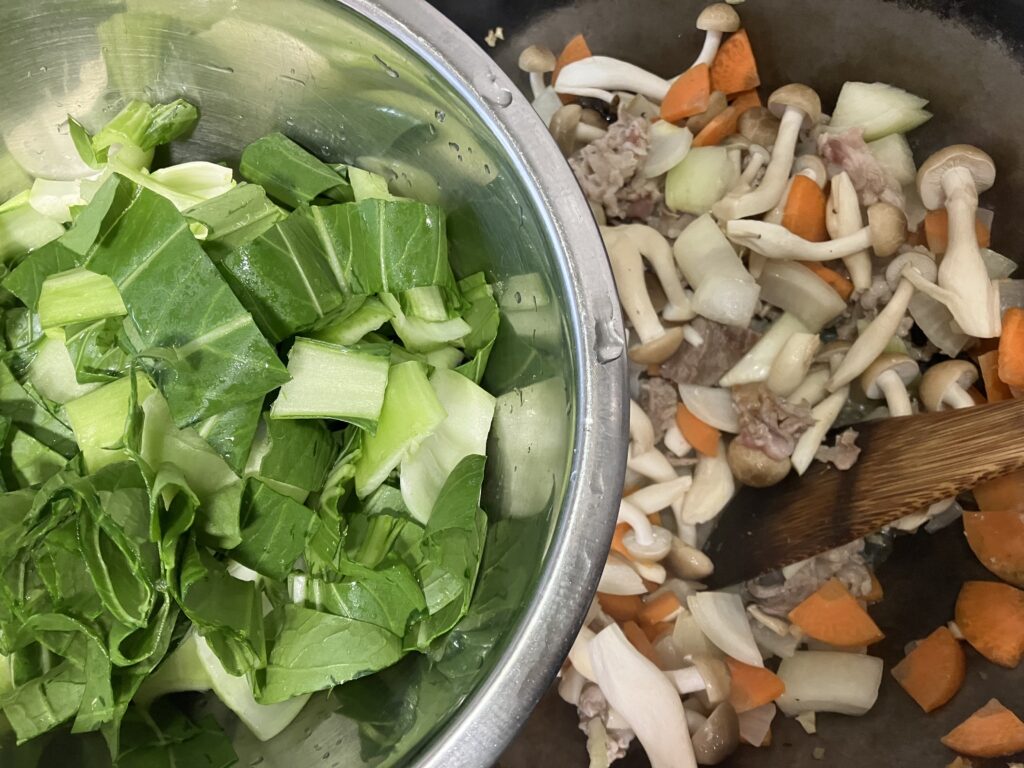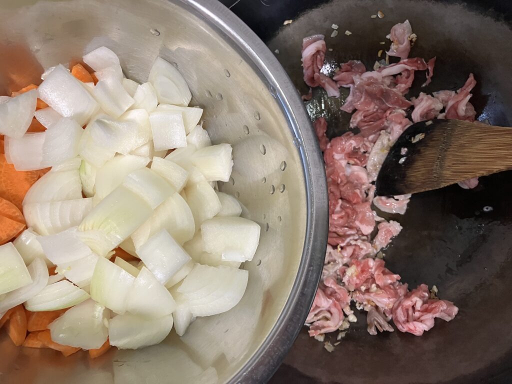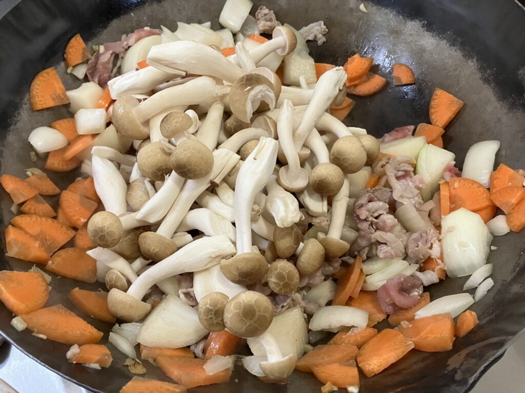 ①にんじんは薄めのいちょう切り、玉ねぎはひと口大、青梗菜は2㎝幅くらいに、生姜・にんにくはみじん切りに、豚肉は食べやすい大きさに切っておく。しめじは石づきを取ってほぐし、さっと洗う。(きのこは洗わなくてもいいという意見もあるので洗うか洗わないかはお好みで)