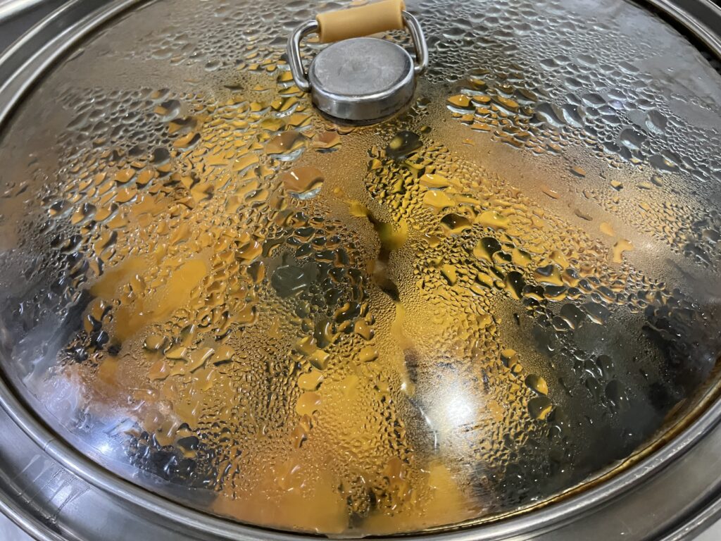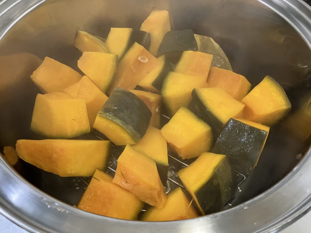 ②適当に切ったかぼちゃを網の上に並べて蓋をして蒸す。