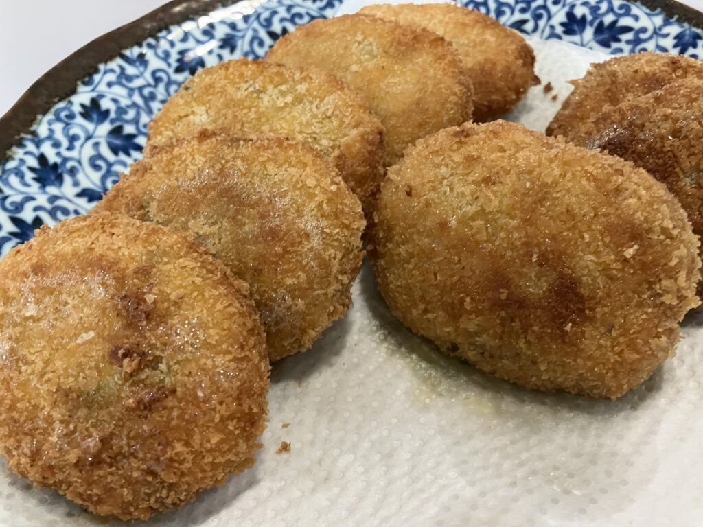 ④薄力粉をまぶし、溶き卵にくぐらせてパン粉をつけて揚げる。