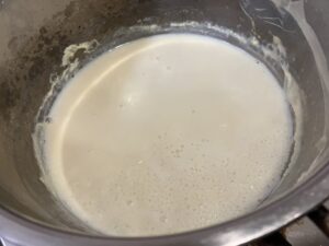 ①鍋に豆乳を入れて火にかける。(最初は中火、豆乳が温まったら弱火)