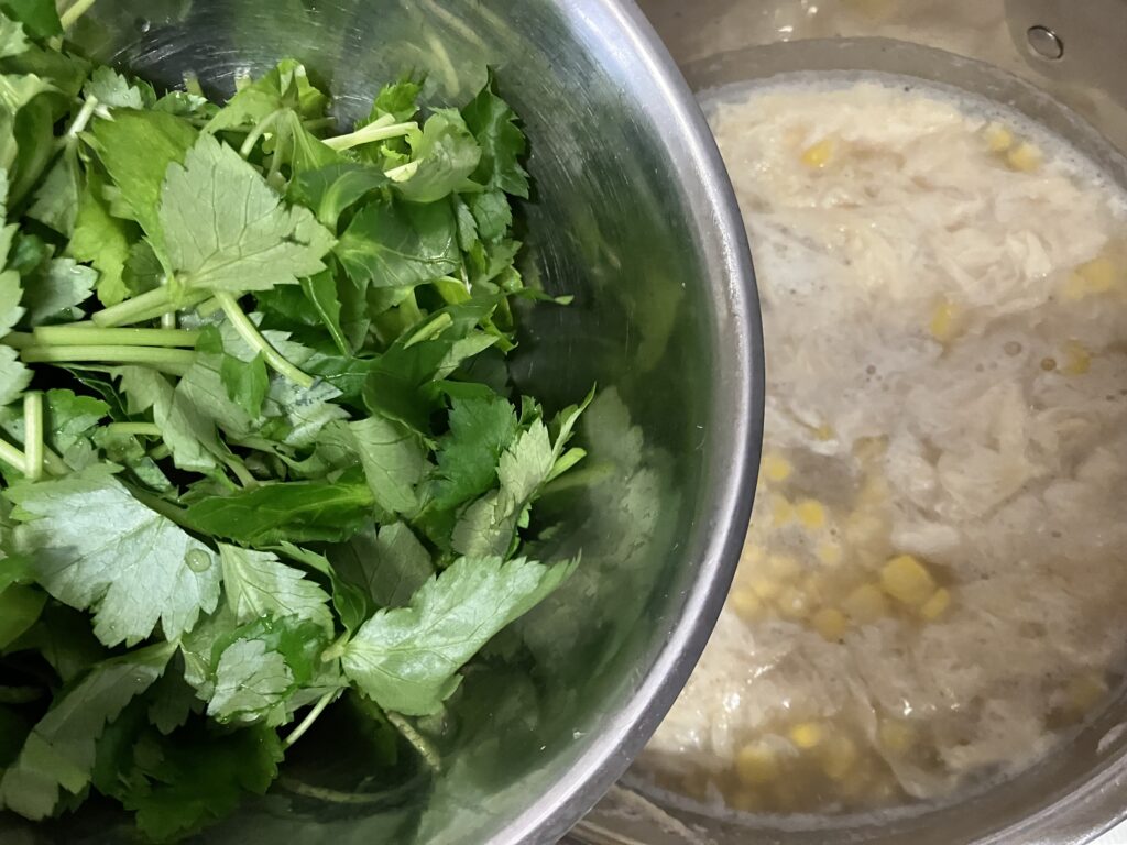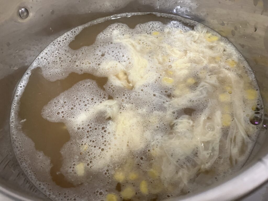 お湯が沸いたら、コーン・塩・こしょう・野菜ブイヨン・しょうゆ・酒・湯葉(鍋に残った分も)・みつ葉を入れて、ひと煮立ちしたら、できあがり♪