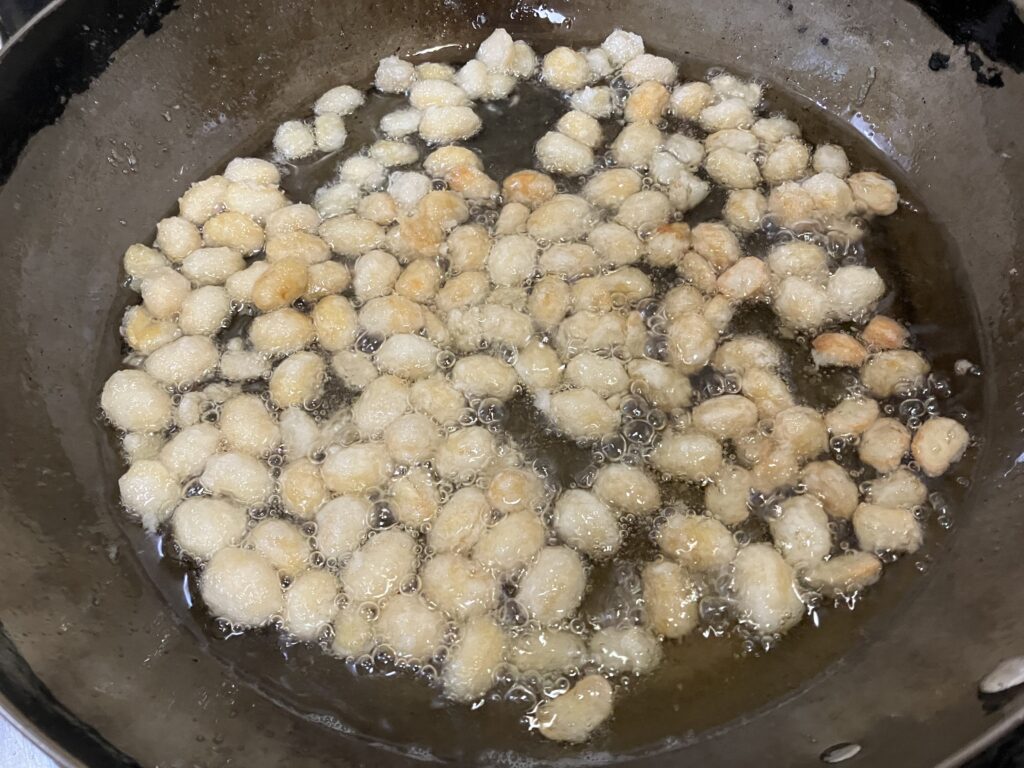 ①大豆は片栗粉をまぶして油で揚げ焼きにして一度取り出しておく。