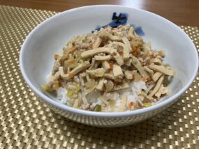 また、学校給食ではコンソメスープの素が使われますが、持参給食では省いています。入れたい場合は塩を半量にして、その分コンソメスープの素を加え、しょうゆはそのままって感じでいいかと思います。