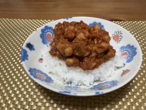 学校給食ではここにケチャップも加わりますが、今回はトマト缶の量を増やして砂糖と酢を追加してなんちゃってケチャップとし、ケチャップ不使用レシピにしています。ケチャップを使う場合は、トマト缶を半量の200gにしてケチャップを70gくらい入れてください。入れるタイミングはトマト缶と同じです。